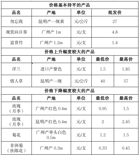 本周行情分析:本周鲜紫色洋兰、情人草等品种价格上涨;玫瑰、菊花、非洲菊等品种价格下调;勿忘我、向日葵、富贵竹等品种价格基本持平。