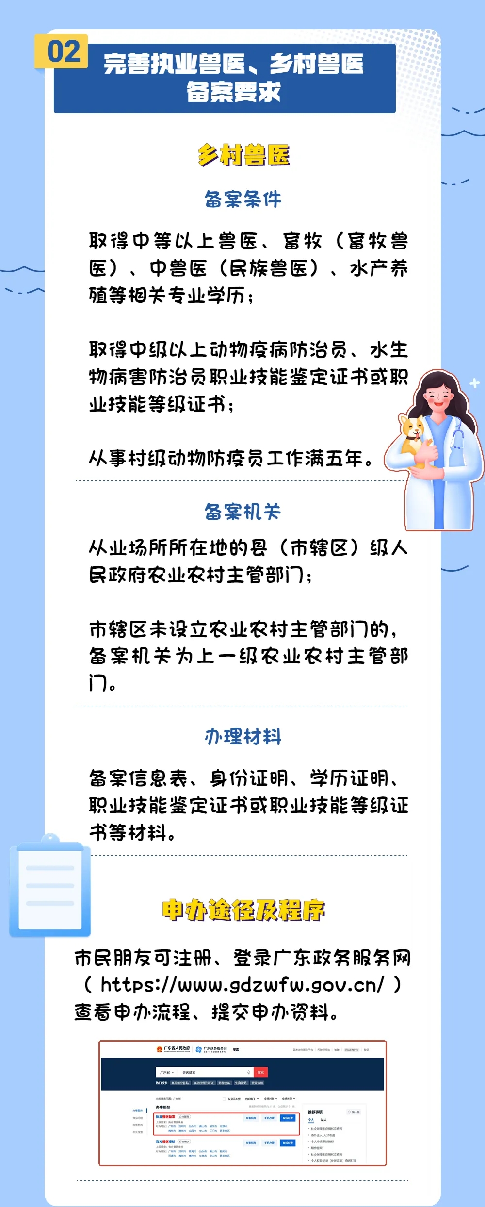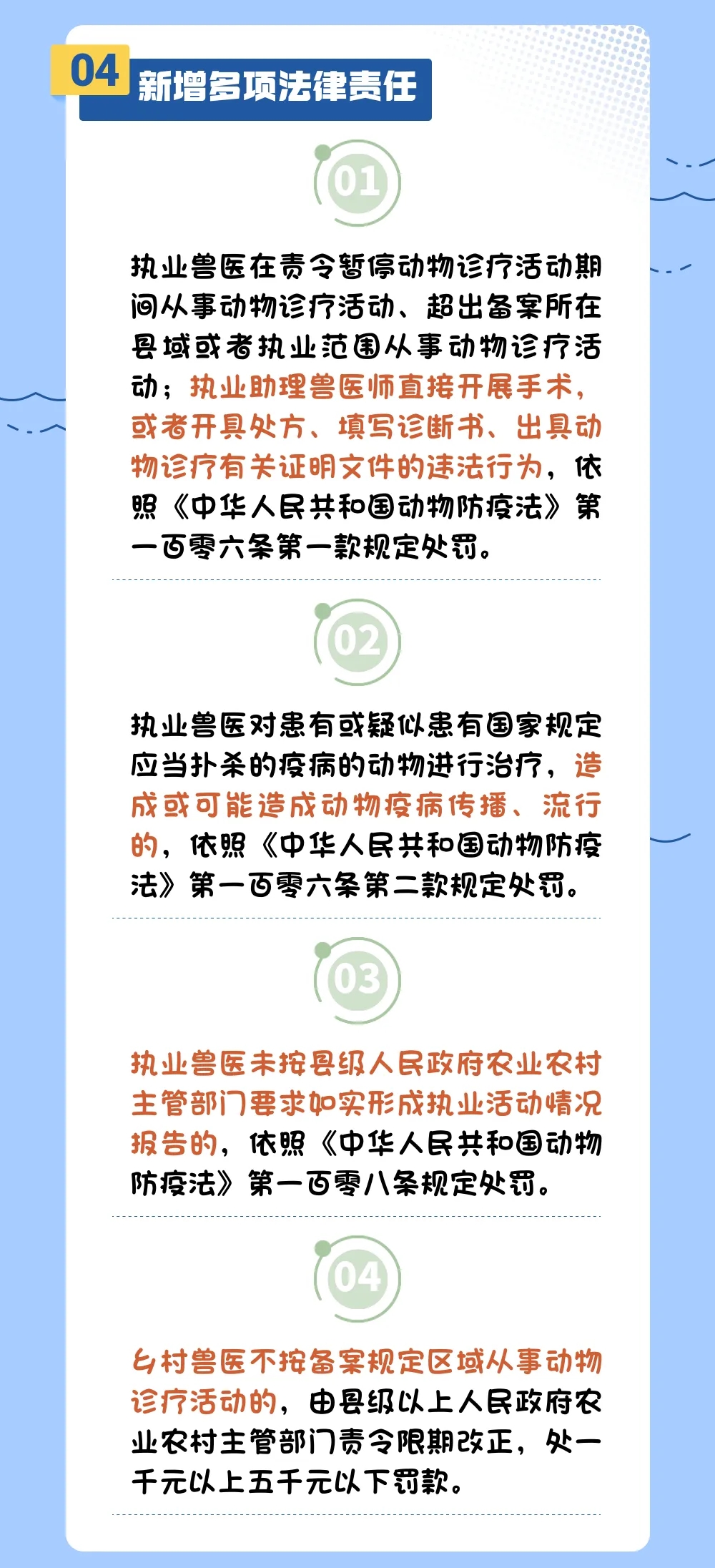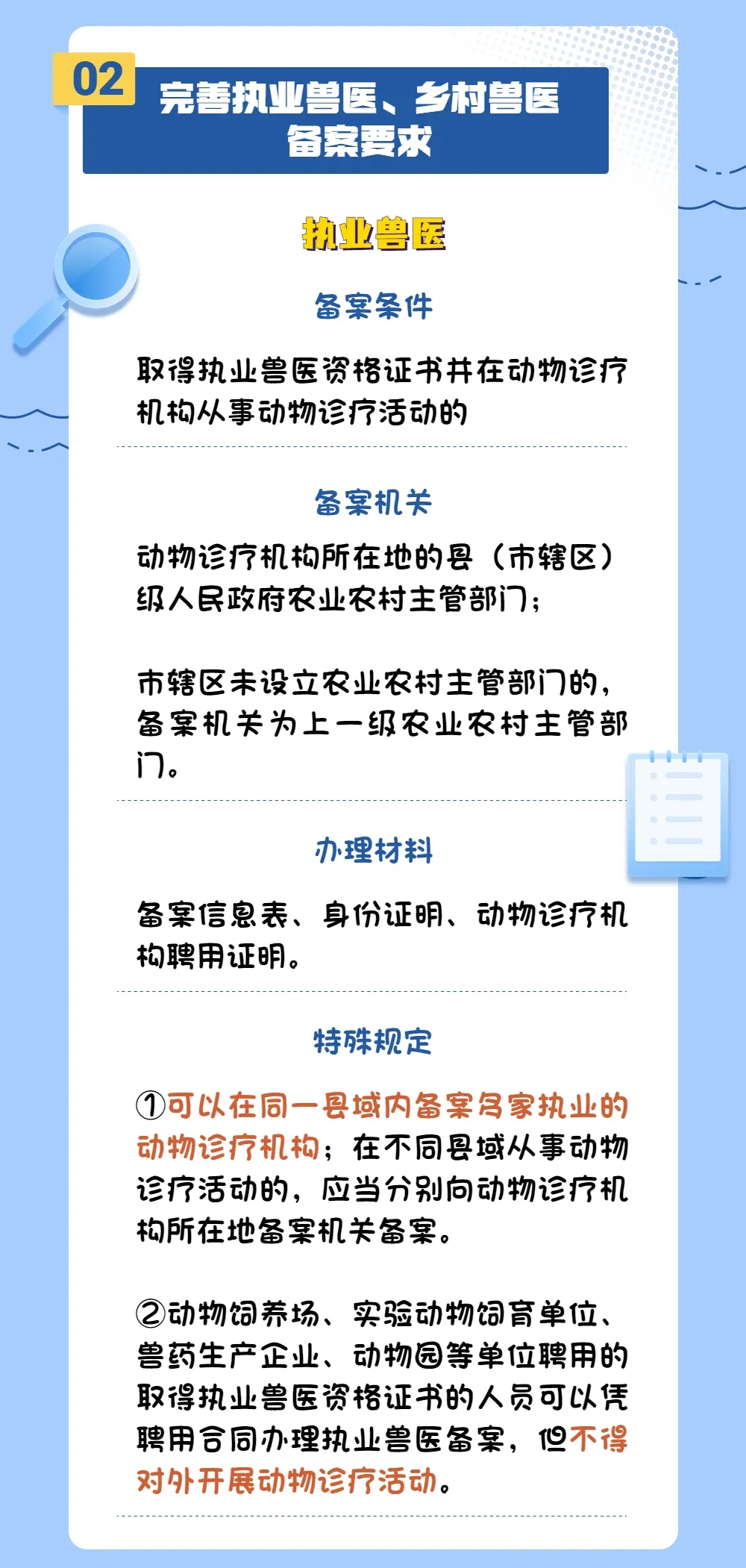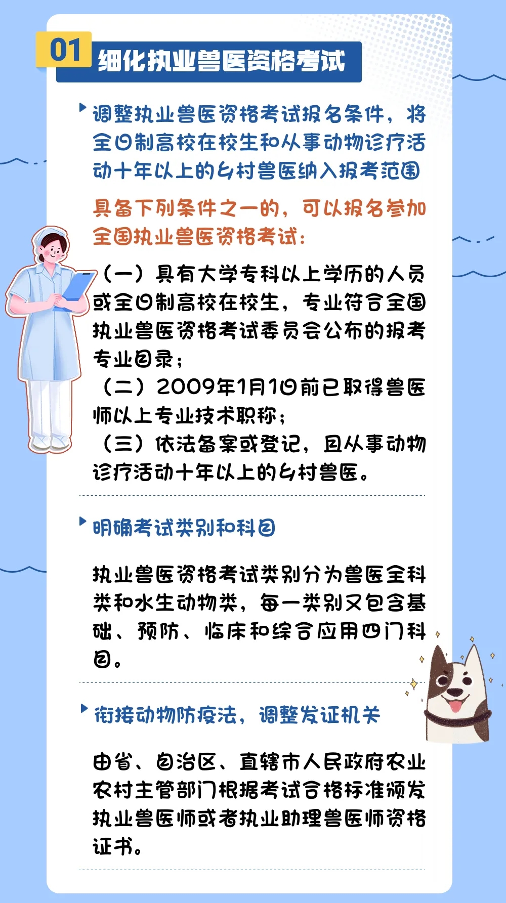 为适应动物防疫工作需要和“放管服”改革要求,并与《中华人民共和国动物防疫法》等法律法规相衔接,农业农村部对原《乡村兽医管理办法》《执业兽医管理办法》进行修改,并将其合并修改成新的规章——《执业兽医和乡村兽医管理办法》。一起学习执业兽医资格考试及执业兽医、乡村兽医备案等新规定。