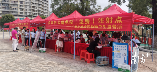 9月28日上午,在增城区儿童公园,市、区两级动物防疫人员在现场设立咨询点,向市民派发《科学饲养 远离疫病》《共同行动 预防狂犬病》等资料,宣传狂犬病的危害和解答相关问题。此外,动物防疫人员还联合当地官方兽医、动物诊疗机构到现场免费为市民的犬猫注射疫苗,用行动切实巩固广州市狂犬病免疫防线。