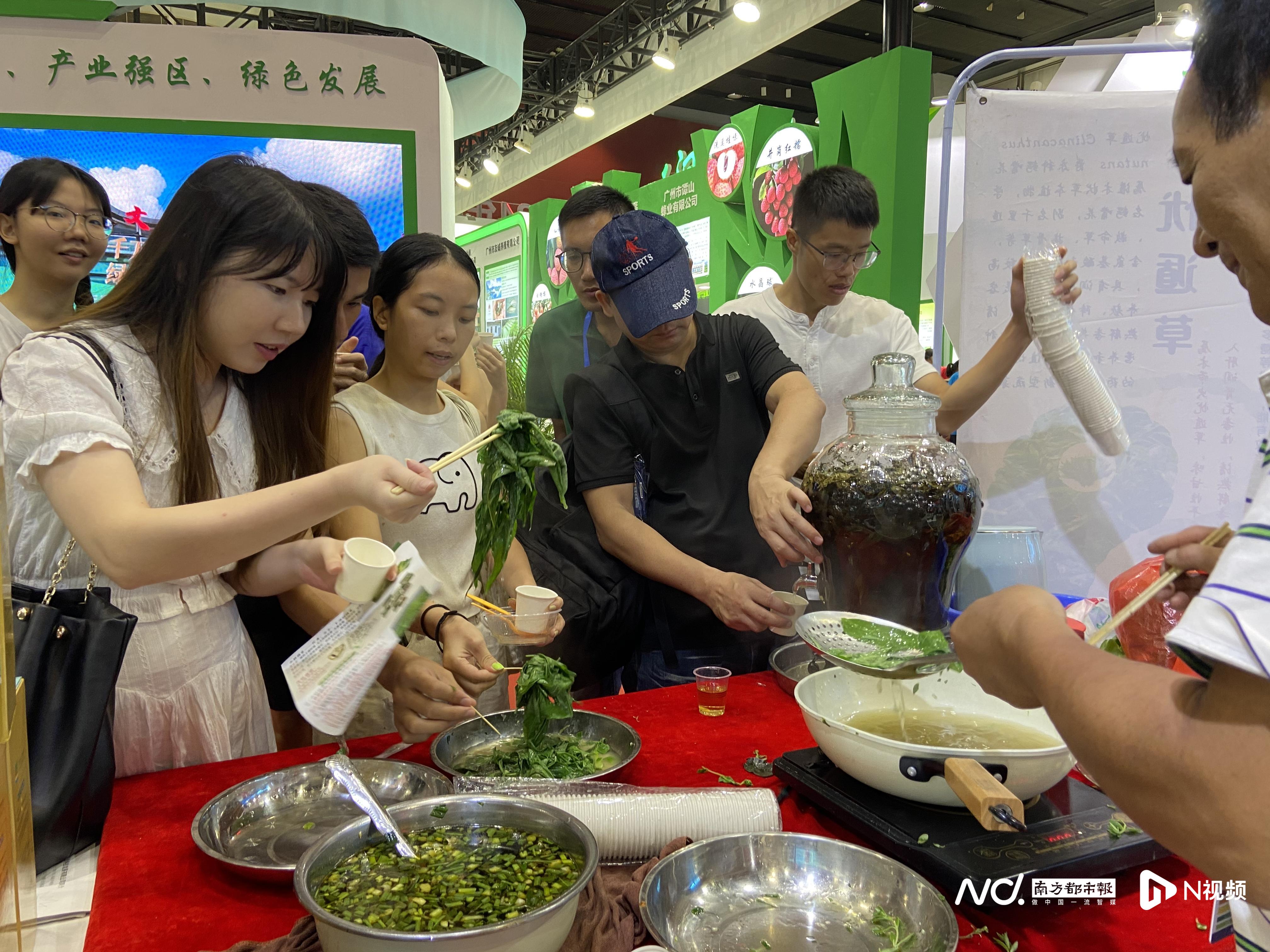 老广有多钟爱绿叶菜?在增城区的展位,摆一台电煮锅,抓一把新鲜蔬菜扔锅里,只需清水白灼,便有扎堆的观众拿着小纸杯将其“瓜分”,哪怕只淋上少许酱汁,他们也吃得津津有味。