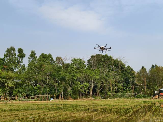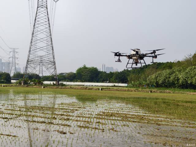 早稻插秧之后,田间管理是关键。4月8日下午,在番禺区石基供销社低涌水稻种植基地,一幅现代农业的生动画面正在展开,一架农用无人机穿梭于稻田上空,给稻田里的禾苗施肥,为早稻丰收奠定基础。